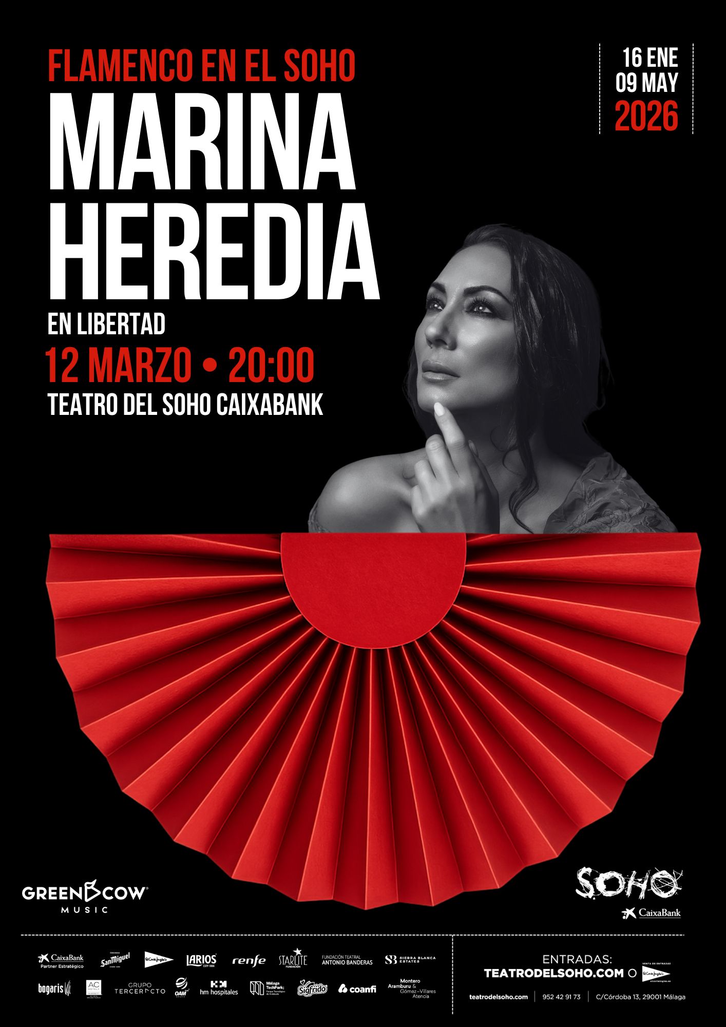 Flamenco en el Soho celebrará su sexta edición a lo largo de toda la temporada. Una vez más, el Teatro del Soho CaixaBank contará con la colaboración de Green Cow Music y Javier Esteban para ofrecer lo mejor del flamenco actual en el escenario.